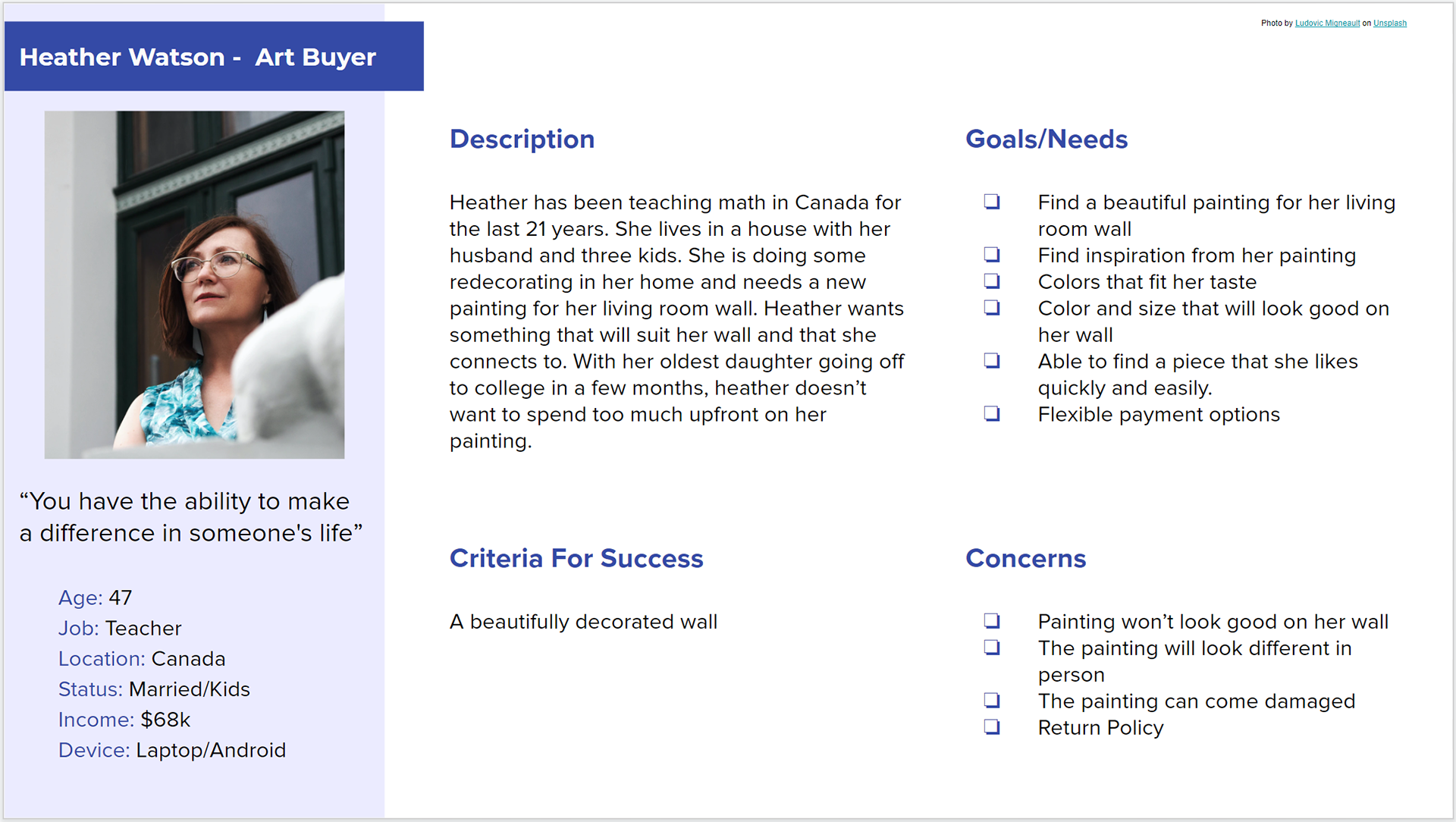 2. The second user persona presents Heather Watson (Art Buyer), whose main goal for this site is to find a painting that will help her have a beautifully decorated wall.