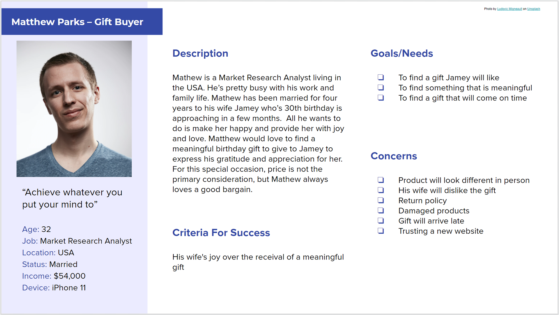 3. The third user persona presents Matthew Parks (Gift Buyer), whose main goal for this site is to find a meaningful gift that will bring his wife joy.