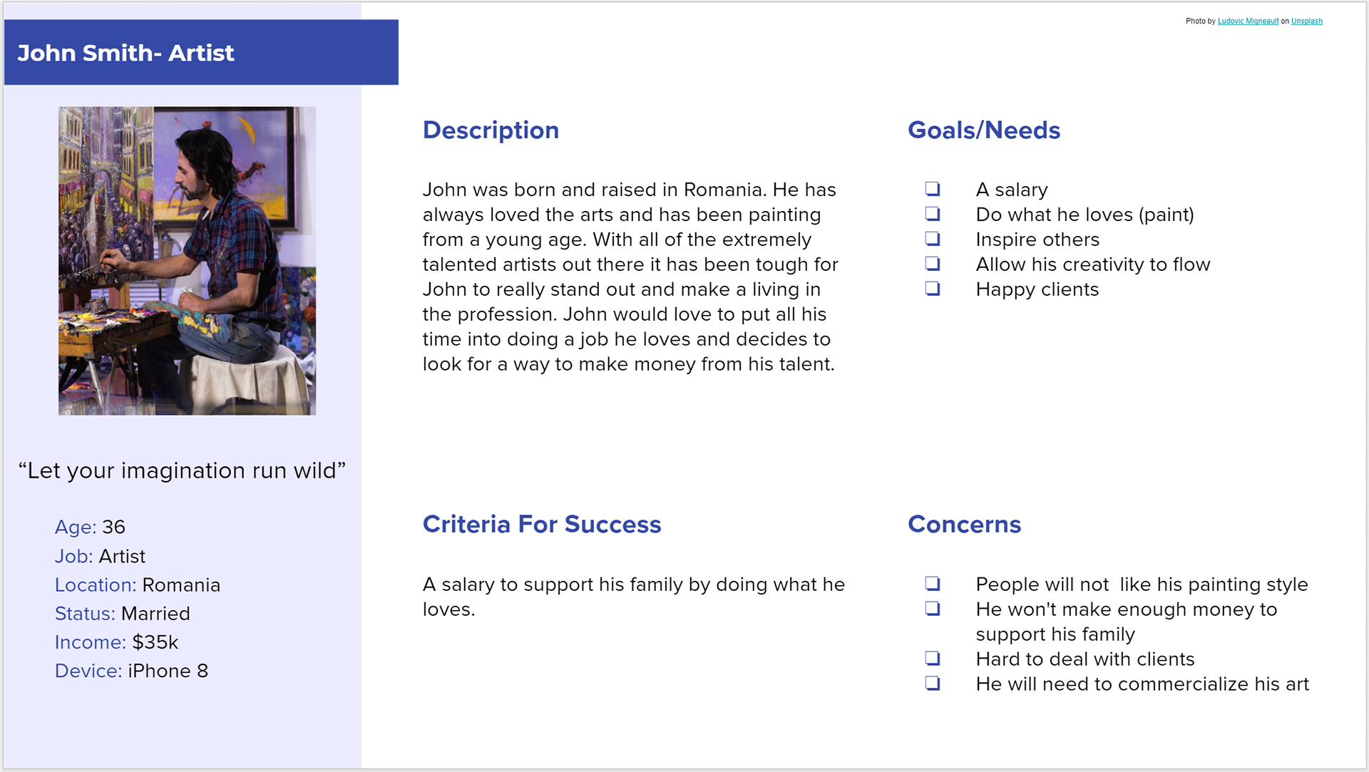 1. The first user persona presents John Smith (the artist), whose primary goal is to earn an income to support his family by doing something he loves.